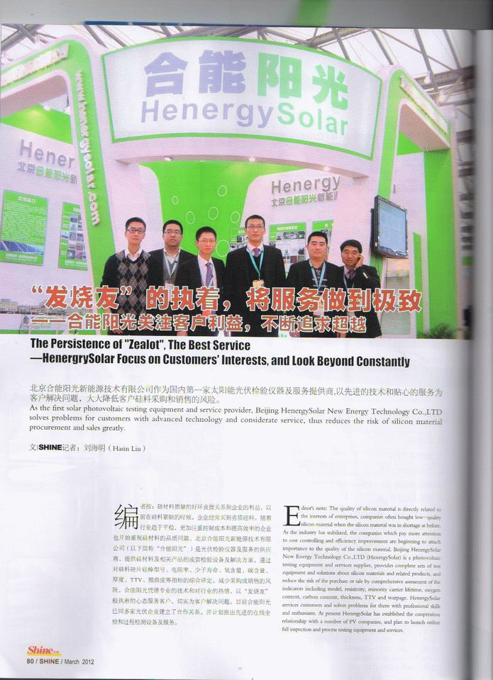 編者按:硅材料質(zhì)量的好壞直接關(guān)系到企業(yè)的利益,以前在硅料緊缺的時候,企業(yè)經(jīng)常買到劣質(zhì)硅料。隨著行業(yè)趨于平穩(wěn),更加注重控制成本和提高效率的企業(yè)也開始重視硅材料的品質(zhì)問題。北京合能陽光新能源技術(shù)有限公司(以下簡稱“合能陽光”)是光伏檢驗儀器及服務(wù)的供應(yīng)商,提供硅材料及相關(guān)產(chǎn)品的成套檢驗設(shè)備及解決方案,通過對硅料硅片硅棒型號、電阻率、少子壽命、氧含量、碳含量、厚度、TTV、翹曲度等指標(biāo)的綜合評定,減少采購或銷售的風(fēng)險。合能陽光憑借專業(yè)的技術(shù)和對行業(yè)的熱情,以“發(fā)燒友”般執(zhí)著的心態(tài)服務(wù)客戶,切實為客戶解決問題。目前合能陽光已同多家光伏企業(yè)建立了合作關(guān)系,并計劃推出先進的在線全檢和過程檢測設(shè)備及服務(wù)。